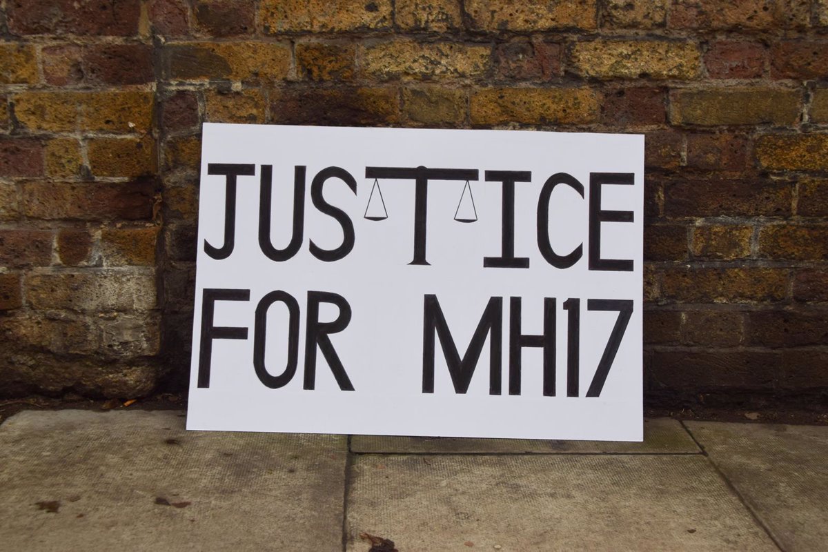 **Archivo** – Un cartel pidiendo «justicia» para las víctimas del vuelo MH17, derribado por un misil ruso cuando sobrevolaba el este de Ucrania – Europa Press/Contacto/Vuk Valcic – Archivo
